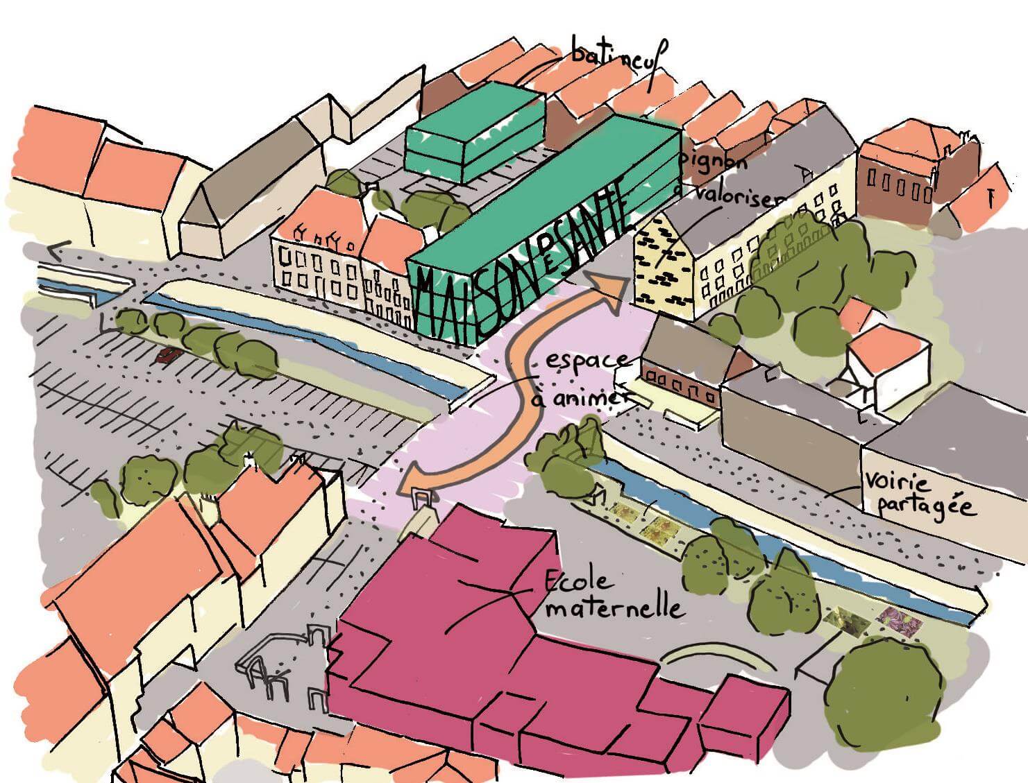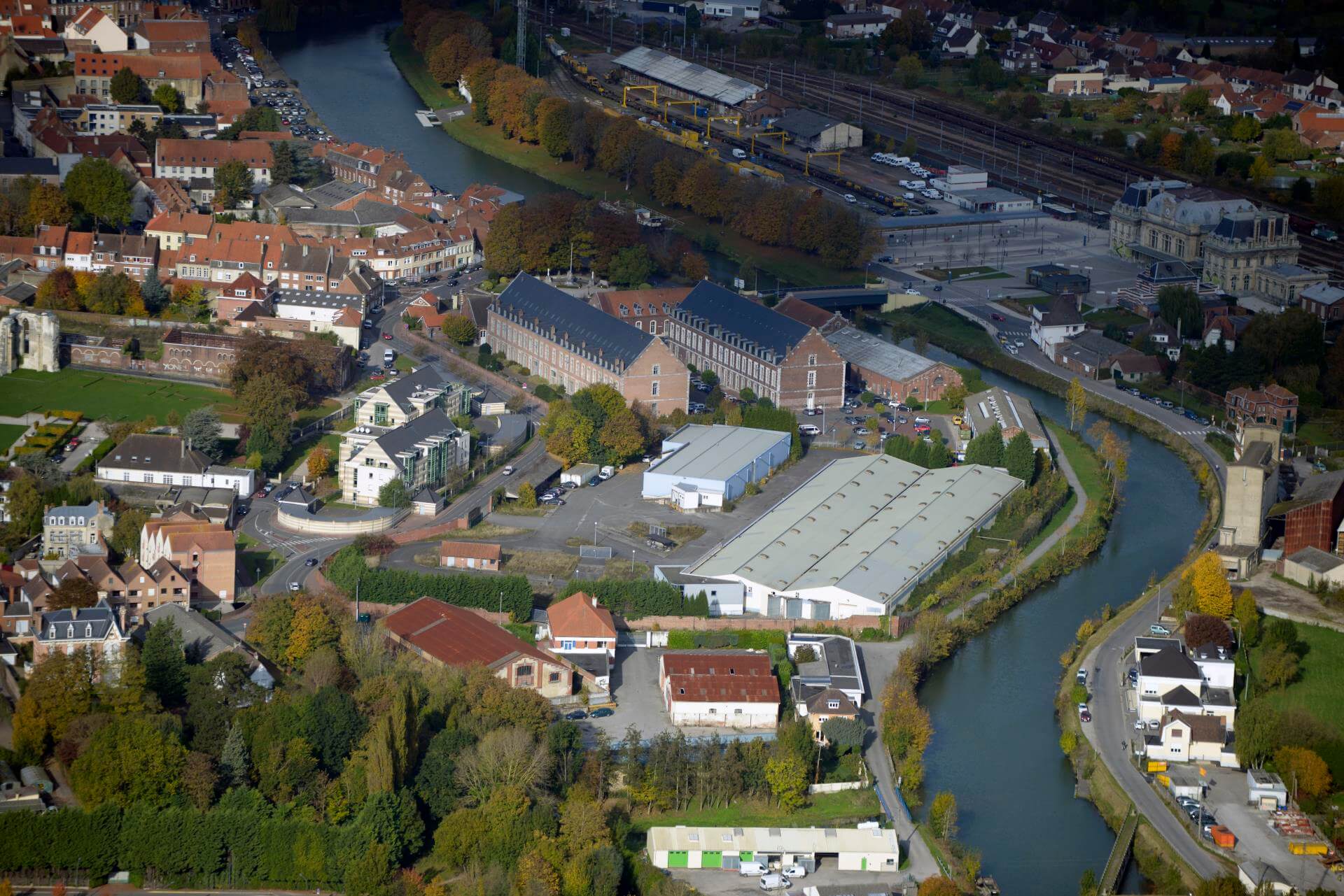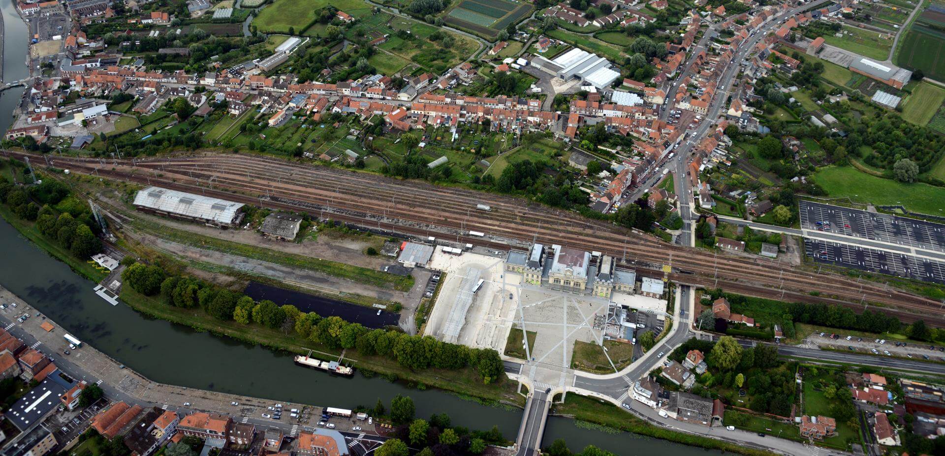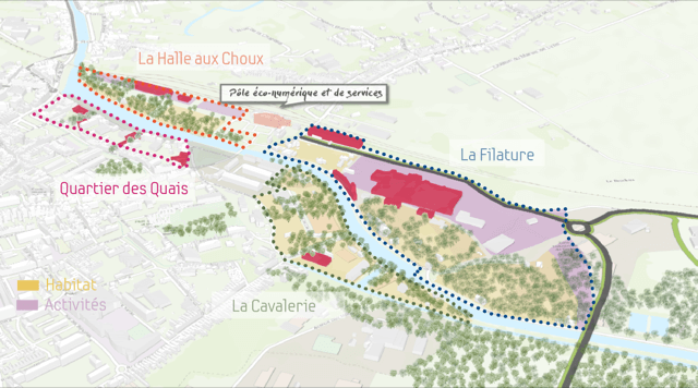 Ce quartier fait le lien entre la gare, le centre historique et les faubourgs. Grâce à la nouvelle passerelle piétonne et cyclable, il va devenir le trait d’union naturel des déplacements piétons et cyclistes entre ces trois pôles. Les surfaces foncières disponibles pourraient permettre, à terme, la création de 120 logements. La vocation économique traditionnelle du secteur sera retrouvée avec un potentiel de 10 000 m2 d’activités tertiaires entre la gare et le canal. Le développement d’un espace de logistique urbaine pourrait également être envisagé. Les véhicules accèderont au site par une voie interne laissant la berge aux modes doux. Des espaces verts publics ou privés traversant et perpendiculaires au canal feront le lien entre les deux. Le stationnement sur la rive droite sera localisé de manière privilégiée entre la future voirie et les espaces ferroviaires, mais aussi en rez-de-chaussée des bâtiments d’activités.