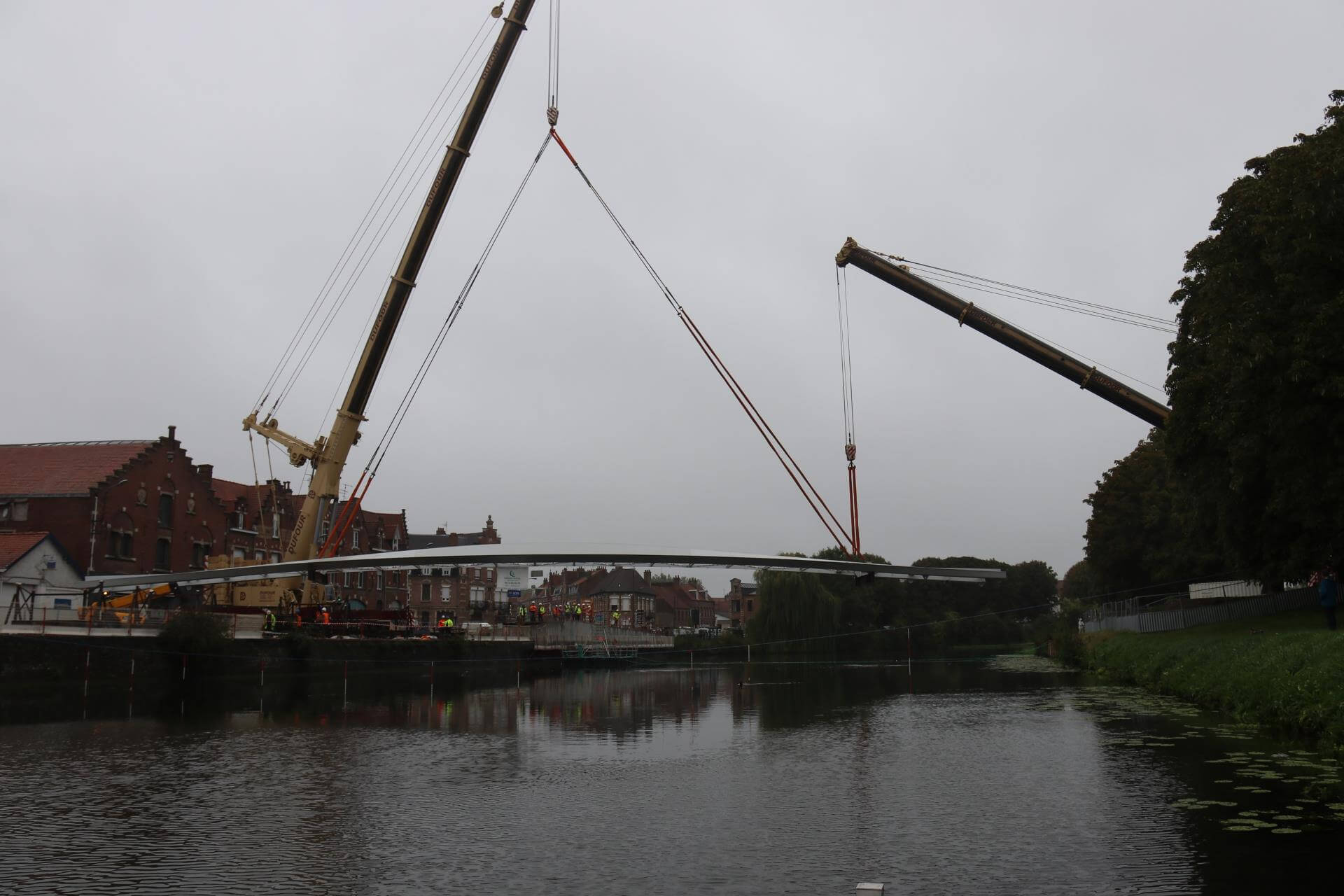 Réalisé par ACML, sur les plans de Bertrand Potel l’architecte, la passerelle a été assemblée sur le quai du commerce avant d’être posée le mercredi 30 août 2017. Ce jour-là, deux grues gigantesques avaient interprété un ballet impressionnant sous les yeux subjugués des riverains.